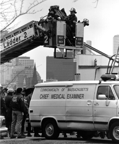 Cambridge firefighters use an aerial ladder to bring down the crash victims remains from the roof.