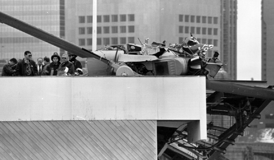 The wreck of the State Police helicopter. The top of the helicopter and the broken rotor are visible.