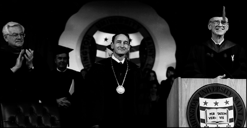 Former Provost Mark. S. Wrighton (center) was formally installed as the 14th chancellor of Washington University in St. Louis on Oct. 6. After receiving the Chancellor's Medallion from his predecessor William H. Danforth (right), Wrighton gave his inaugural address, "Learning and Discovery: Gateways to the 21st Century," Wrighton took office on July 1.