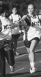 Robin Evans '99 hands the baton to Natalie Smith '00 on their way to winning the 4 x 400 meter relay in Wednesday's track meet at Steinbrenner Stadium. Evans also won the 800 meters in 2:32.2, and Smith won the 400 meters in 1:03.7.