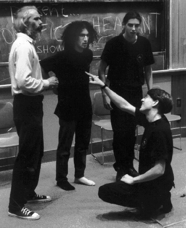Roadkill Buffet's Joseph N. Kaye '99, Matthew W. Davis '99, and Renegade Duck's Austin de Besche perform "Story, Story, Die" in their Saturday night show in 6-120.
