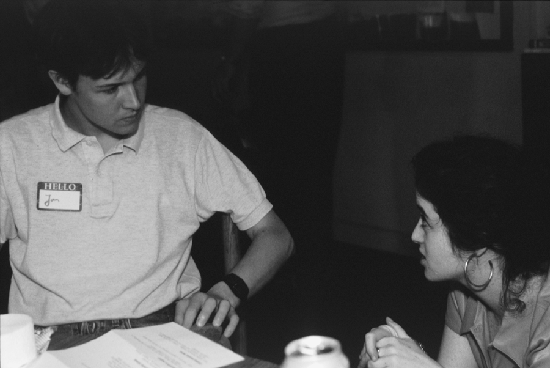 Renee Hoffman (right), assistant to the associate director of the Educational Studies Group talks to Jan Meyer '01 at the program's open house yesterday.