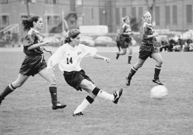 Alexandra Pearlman '00 shoots on goal in Tuesday's game against Curry College. MIT won 2-0.