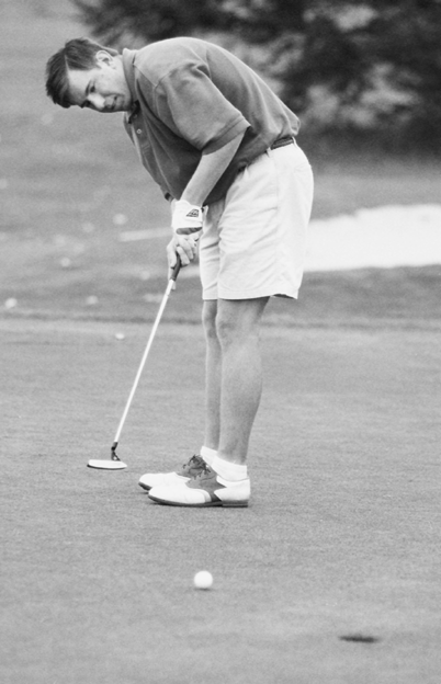 Todd Kamin '00 holds his breath before his ball lands in the 14th hole at Christal Spring golf field, near Haverhill, on Tuesday.