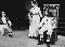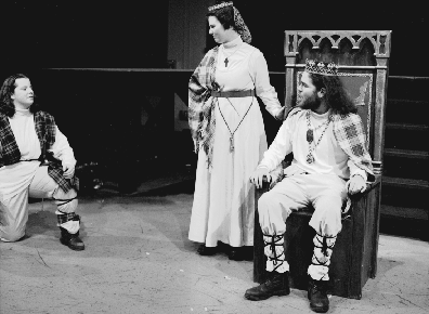 Banquo (Sarah Cohen '00) bids farewell to the newly crowned King Macbeth (Fernando Palz '98) and his wife (Jenny James Matta '98) before leaving on a fatal ride.