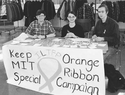 | Erik Nygren G, Nicholas Ingolia '00 and Edmund Golaski '99 hand out orange ribbons to passing students in order to voice disapproval of the MIT administration's recent decisions. |