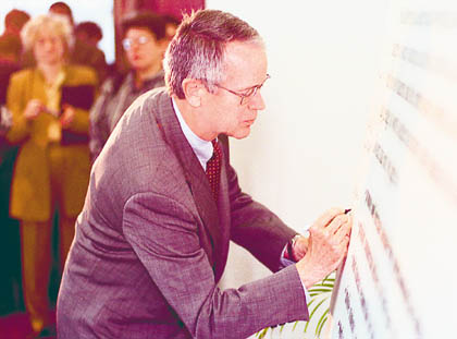 | President Charles M. Vest signs an agreement along with 23 other Boston-area colleges to curtail underage and dangerous drinking. The signing took place Monday at Northeastern University. |