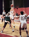 Greg Kuhnen -- The Tech Katie Spade '99 passes the ball to Vicky Best '99 in Tuesday's game against Babson College. MIT lost in overtime 61-57. |