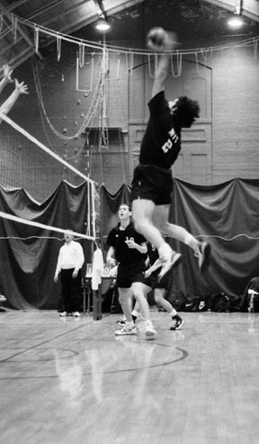 Nikolaos Michalakis ’01 rises to viciously spike the ball in the Engineers match against William Woods University Thursday in DuPont Gymnasium. MIT lost 3-1.