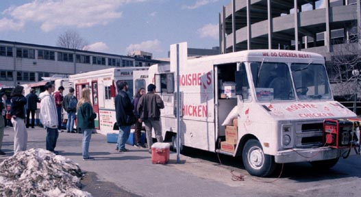 Noontime lunchgoers wait in long but swift lines for the varied lunch truck cuisines.