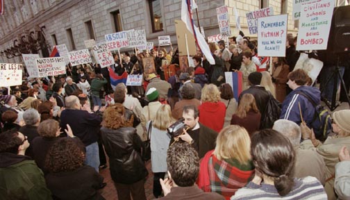 One of several protests worldwide against NATO bombings against Yugoslavia took place last Saturday at Copley Place, Boston.