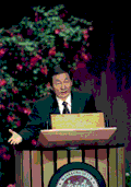 “I am very much in favor of equality between men and women,” despite the contrary Chinese tradition of a male-dominated society, Zhu said. He cited State Councilor Madame Wu Yi, who accompanied him on his U.S. tour, as an example of gender equity in China’s government. Referring to the WTO talks, Zhu said that “in this round of negotiations, she was the Premier, and I was the Vice Premier.” As he finished his comments, Zhu joked that “at home, I am totally an obedient servant of my wife.”