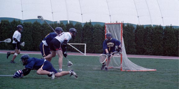 Pascal Rettig ’01 fires a shot to score against the Massachusetts Maritime Academy Buccaneers Wednesday in Steinbrenner Stadium. MIT triumphed 13-8 to improve their record 5-1.