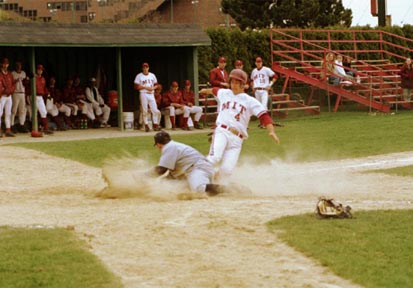 Tim Gilmartin ’01 slides into home plate to score a run against Gordon College in last Friday’s game. MIT had a decisive victory winning 13-4.