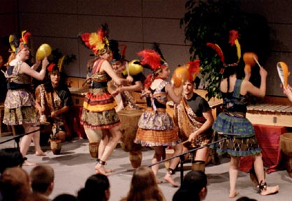 Members of the MIT African Music Ensemble inspire the audience as they energetically dance and perform music on traditional African instruments Friday evening in Wong Auditorium.