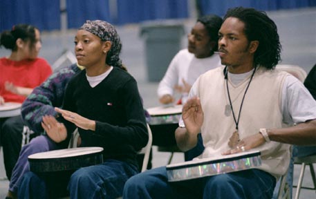 La Tonya Green G and Lawrence Durant demonstrate rhythms for youth participants in the Rhythm of Youth program, held last Saturday in Johnson Athletic Center.