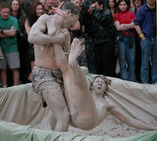 Jan-Christian Nelson ’98 drops Rhett Creighton ’02 in a mud wrestling match as part of Steer Roast festivities Friday.