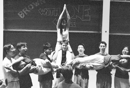 Members of the Christian a cappella group, the MIT Cross Products, demonstrate vector algebra at their 10th Anniversary Concert Saturday in 10-250.