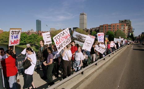 Hundreds of people fill the Harvard Bridge weekly in “Walk for Peace” from Copley Square to Central Square, protesting against NATO bombings of Yugoslavia.