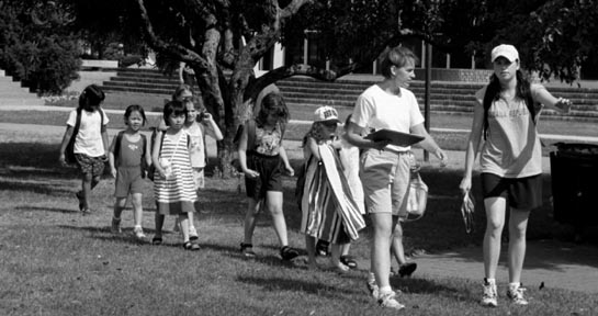 Two MIT students lead a group of children for an afternoon of swimming at the Alumni Pool Friday June 25.