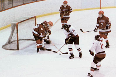 MIT followed up that big victory with a let down against Bates. MIT fell behind 20 early in the game. With the early lead and a boisterous crowd supporting them, Bates dominated the first period and the early minutes of the second period. Play was stopped early in the second period to repair a broken pane of glass at the ice level. The stoppage allowed MIT to regain their composure, and they scored two quick goals after play resumed to tie the game. The game was tied at 33 in the third period when Bates scored to take the lead with only seven minutes remaining. After taking a penalty late in the game with only four minutes remaining, it began to look like MIT's winning streak would be coming to an end. However, in a true display of determination and penalty killing, MIT was able to steal the puck which led to a short handed goal by Geller. With only one minute remaining in the game McKeone stole the puck and put a shot on goal after a breakaway. The Bates goalie made an incredible save, but Mike Woods '00 was there to bury the rebound and give MIT the last minute 5-4 victory.