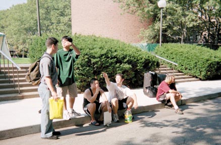 Orientation workers greet and direct a freshman arriving on campus via the airport shuttle bus yesterday on Amherst Alley.