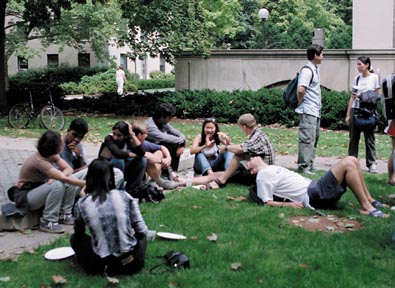 As part of International Orientation, students lounge during a pizza party near East Campus Monday afternoon.