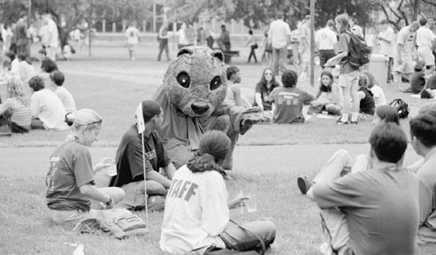 Tim the Beaver visits new students lounging near Rockwell Cage during the Freshman Picnic yesterday afternoon.