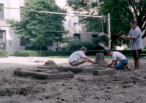 Jon Kennell ’02, Octavio Gutierrez ’01, and David McIlroy ’03 build a sand sculpture of MIT outside of East Campus.