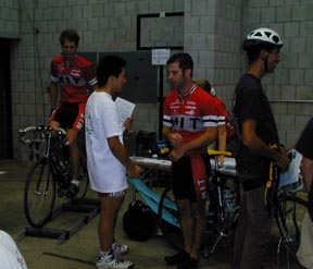 MIT Cycling Club athletes address a freshman’s questions and show off their bikes during last night’s Activities Midway.