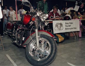 Campus Police officer Ron Ward lures freshman to the MIT Motorcycle Club table at the Activities Midway yesterday.