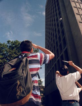 Integrated Studies Program students Ankur Mehta and Thomas Lin fight yesterday’s mid-day sun to watch the annual Egg Drop off the Green Building.