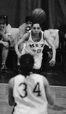 | Eboney Smith '01 passes the ball to Vicky Canto-Ponce '00 in Monday's basketball game against Wentworth Institute of Technology. MIT easily outpaced their opponents, winning the game 69-38. |
