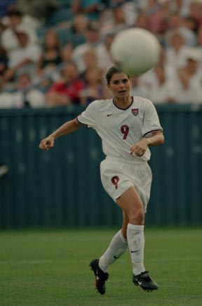 Mia Hamm focuses on her shot during the second half of the contest between the U.S. and the Republic of Ireland.