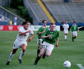 The United States’s Shannon MacMilan tries to overtake Ireland’s Dolores Deasley during a match at Foxboro Stadium last Saturday.
