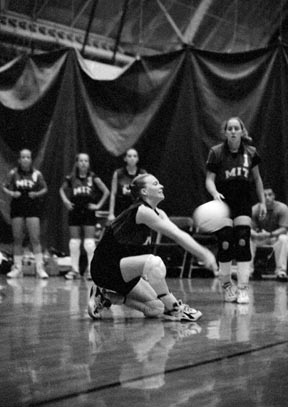 Kathy Dobson ’03 makes a dig during Wednesday’s game against Suffolk University. MIT won in three straight games.