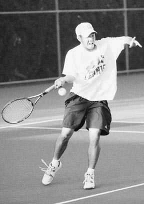 Team captain and two-time All- American Eric Chen ’99 makes a powerful return during Sunday’s match against Wesleyan University. The Engineers triumphed with a total score of 7-0.