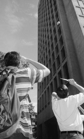Integrated Studies Program hosts the annual Egg Drop off the Green Building during Orientation Week.