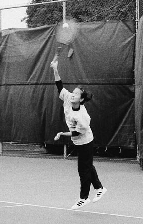 Mealani Nakamura ’00 serves during her doubles match with Kelly Koskelin ’02 against Wellesly College on Tuesday.