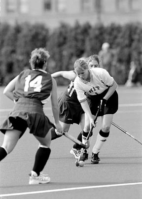 Kristie Tate ’01 weaves through two Smith defenders in Saturday’s game. MIT defeated Smith 3-1.