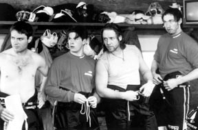 Left to right: Michael Buie, Ryan Northcott, Russell Crowe, and Kevin Durand play small town hockey players whose team is brought to national attention in Mystery, Alaska.