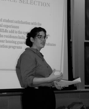 Dormitory Council President Jennifer A. Frank ’00 discusses the Strategic Advisory Committee revisions to the housing lottery yesterday evening in 4-237.