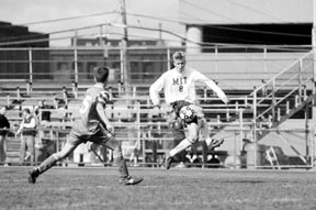 Eric Coulter ’01 intercepts the ball in mid-air during MIT’s match against Clark University. The Engineers won 4-1.
