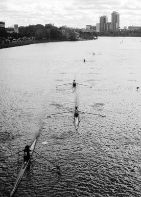 Women’s single sculls race past Magazine Beach on Saturday during the 34th Annual Head of the Charles Regatta.
