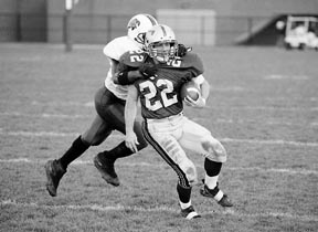 Running back Enrique Villavicencio ’00 gets tackled as he gains control of the ball during Saturday’s game against Nichols College. The Engineers upset the Bison 18-14.