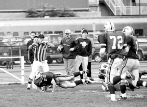 In one of his 19 carries totalling 82 yards, Enrique Villavicencio ’00 dives over the endline to score the first touchdown for MIT in Saturday’s game.