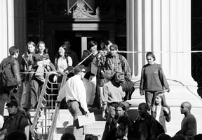 A local news crew attempts to enter 77 Massachusetts Avenue while students evacuate following a small explosion in Room 10-250 Tuesday. Three students were injured in the blast.