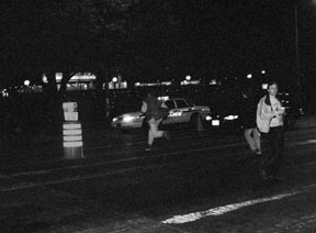Red light, green light -- A student dodges an oncoming car trying to cross Massachusetts Avenue without a properly functioning stoplight.