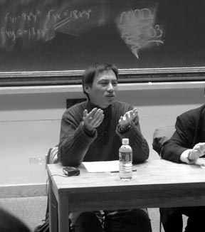 Wang Dan, a leader in the Chinese democratic movement, addresses a large audience in 10-250 concerning his political views and experiences.