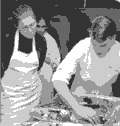 Highlights of the meal were the simple balsamic vinaigrette, the colorful grilled vegetable platters, and the eggplant parmesan. I worked on the eggplant, and was surprised at how easy it was to make a dozen servings. After overcoming my fear of the enormous pot of oil, browning the breaded slices of eggplant was simple. The result was an impressive and tasty dish which I would serve to any large group of people.